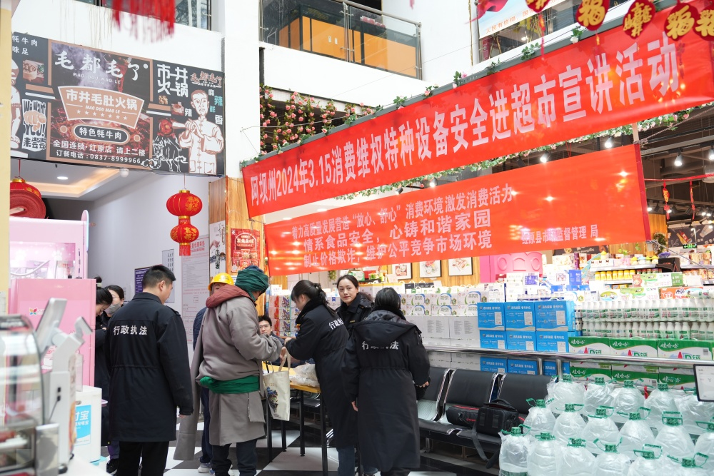 3.15国际消费者权益日即将来临之际,3月6日,阿坝州市场监管局联合红原县市场监管局,在红原县佳惠超市开展“阿坝州2024年3.15消费维权特种设备安全宣讲进超市活动”。